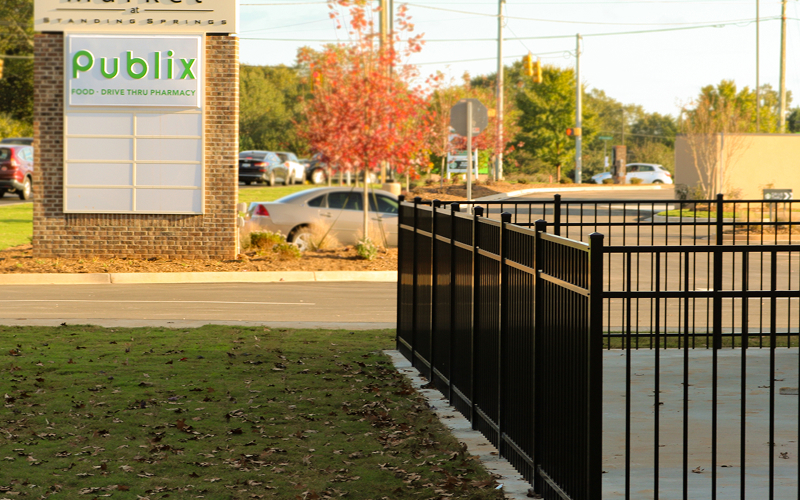 Aluminum fences are a type of fencing we install frequently. We install a few miles of 3 rail or universal top aluminum fences each year. We’ve installed a four foot spear top aluminum fence near Shannon Forest in what we would have called Greenville twenty years ago, but maybe it is Five Forks now. We also frequently do commercial aluminum fences. We core-drilled a three rail fence for the new Publix in Simpsonville off W. Georgia Rd.